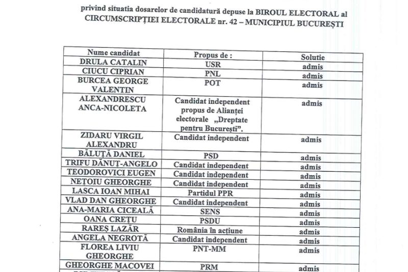 Dintre cei 20 de concurenți care au depus dosare de candidatură pentru Primăria Generală a Capitalei, trei au fost scoși din cursă. Este vorba despre Dan Cristian Popescu, Dumitrică Stan și ASR Marcu Maria, toți candidați independenți.