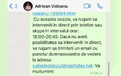 Programul meu nu îmi permite să intervin în direct la emisiunea dumneavoastră. Deschiderea mea către presă este totală, astfel vă transmit acest răspuns și vă solicit prezentarea sa integrală.