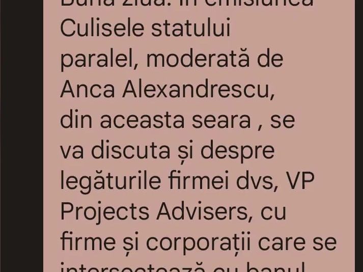 "Eu nu sunt de acord cu afirmația lui Victor Ponta că afacerile firmei sale nu sunt de interes public. El este încă președintele unui partid politic, deci ăsta este un aspect de interes public; pe de altă parte, este consilier onorific al premierului Marcel Ciolacu și îi poate influența astfel deciziile, deci și asta este de interes public, mai ales atâta timp cât aceste companii (cele cărora Ponta le oferă consultanță prin firma sa - N.R.) au interese la nivelul Guvernului României," a explicat realizatoarea emisiunii Culisele Statului Paralel.