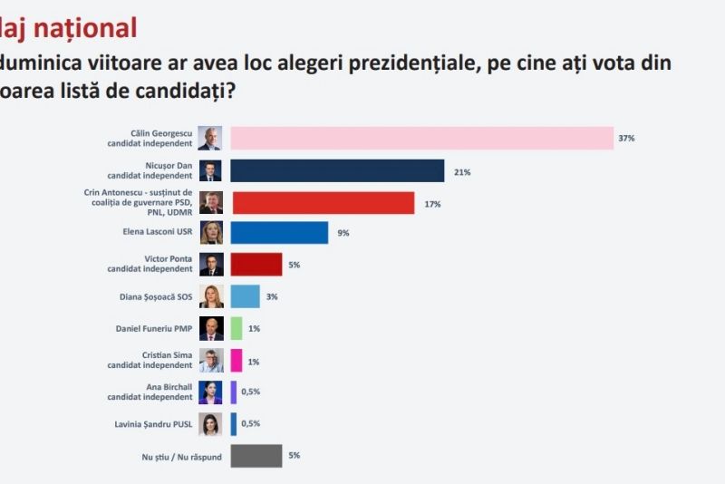 Dacă duminica viitoare ar avea loc alegeri, 37% dintre respondenți ar vota cu candidatul independent Călin Georgescu.