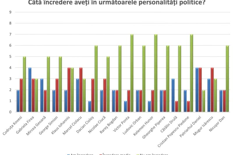Potrivit datelor centralizate de sondajul INSOMAR, românii au cea mai mare încredere în Gabriela Firea, dar și în Patriarhul Daniel. Îi urmează, deși la distanță considerabilă, Marcel Ciolacu, Mircea Geoană și Mugur Isărescu. La polul opus se află Victor Ponta, Kelemen Hunor și Cristian Popescu Piedone. Pe următoarele poziții sunt plasați Nicușor Dan, Dacian Cioloș și Cătălin Drulă.